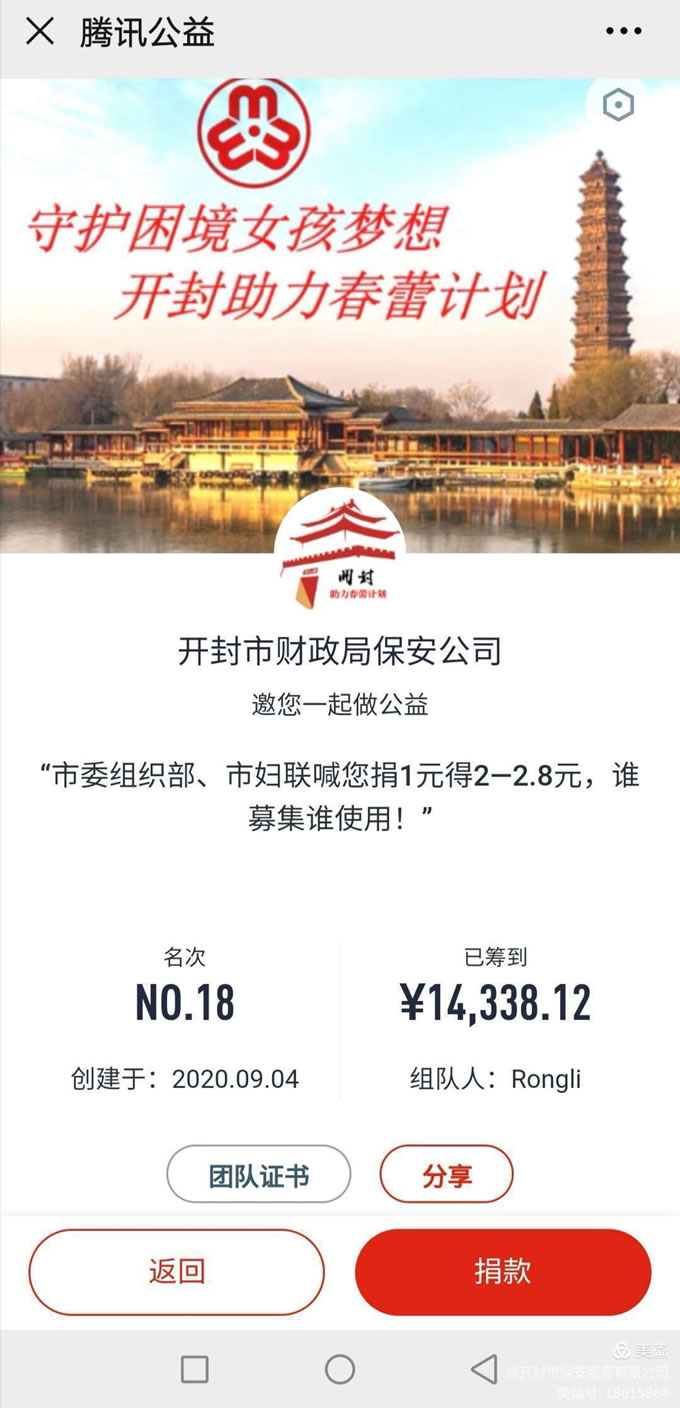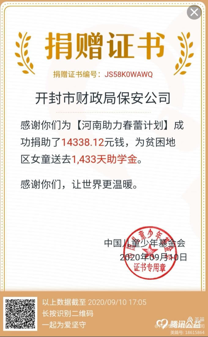 開(kāi)封市保安服務(wù)有限公司開(kāi)展《開(kāi)封市99公益日“春蕾計(jì)劃”項(xiàng)目網(wǎng)絡(luò)募捐籌款活動(dòng)